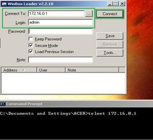 1. Login ke Mikrotik melalui Winbox atau Telnet, dibawah ini salah satu contohnya: