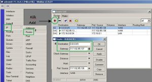3. Klik IP > Routes > Add (+) > Destination (0.0.0.0/0), Gateway (contoh : 117.102.85.137), Pref. Source (contoh : 117.102.85.138).