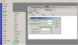 4. Untuk mengisi DNS berikut langkah -langkahnya : IP > DNS > Settings > Primary DNS (203.142.82.222), Secondary DNS (203.142.84.222), setelah itu harap dicentang di bagian Allow Remote Requests: