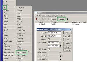 5. Agar PC Client dapat terhubung ke Mikrotik dan mendapatkan IP DHCP Server berikut langkah-langkahnya (note : jika di sisi MIkrotik di set Statik untuk interface ke sisi PC client/LAN, langkah-langkah ini tidak perlu dilakukan) : IP > DCHP Server > Setup > kemudian ikuti instruksi dan langkah-langkahnya: