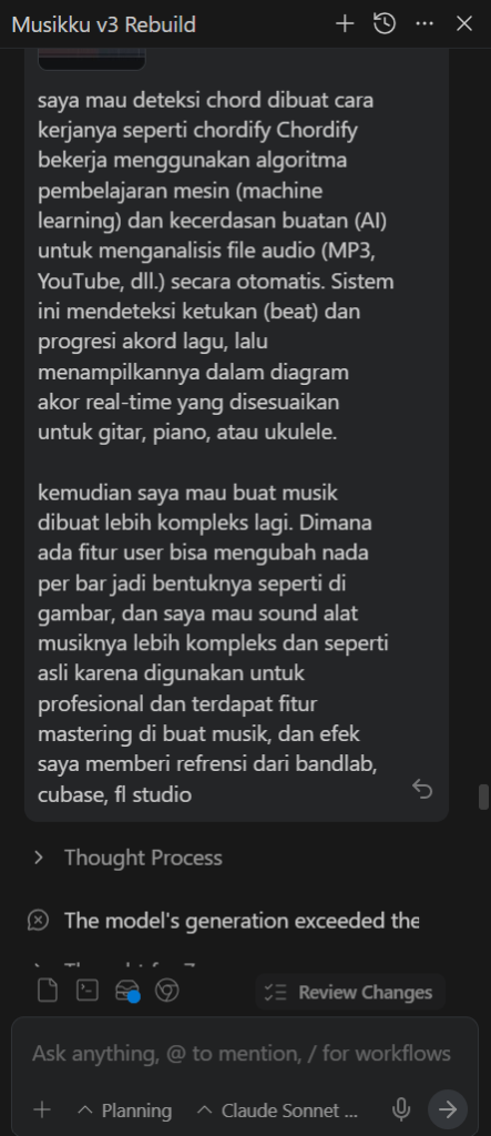 saya mau deteksi chord dibuat cara kerjanya seperti chordify Chordify bekerja menggunakan algoritma pembelajaran mesin (machine learning) dan kecerdasan buatan (AI) untuk menganalisis file audio (MP3, YouTube, dll.) secara otomatis. Sistem ini mendeteksi ketukan (beat) dan progresi akord lagu, lalu menampilkannya dalam diagram akor real-time yang disesuaikan untuk gitar, piano, atau ukulele.