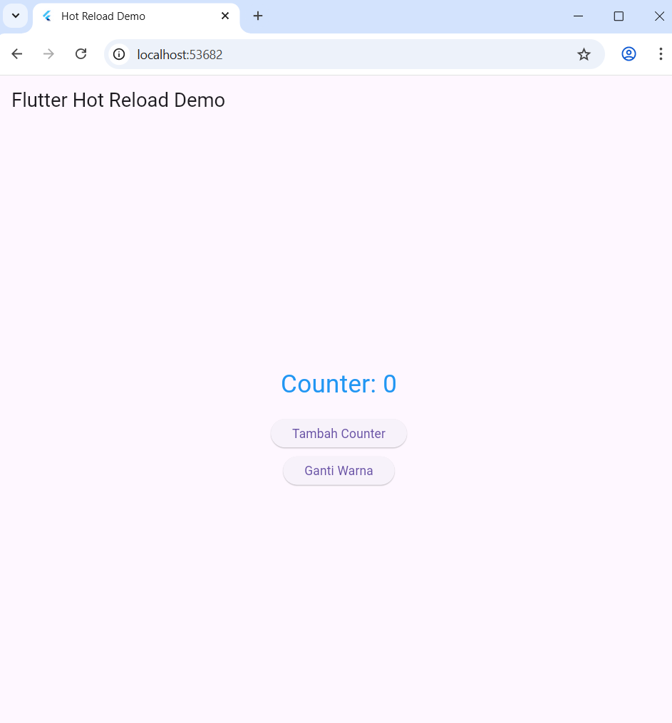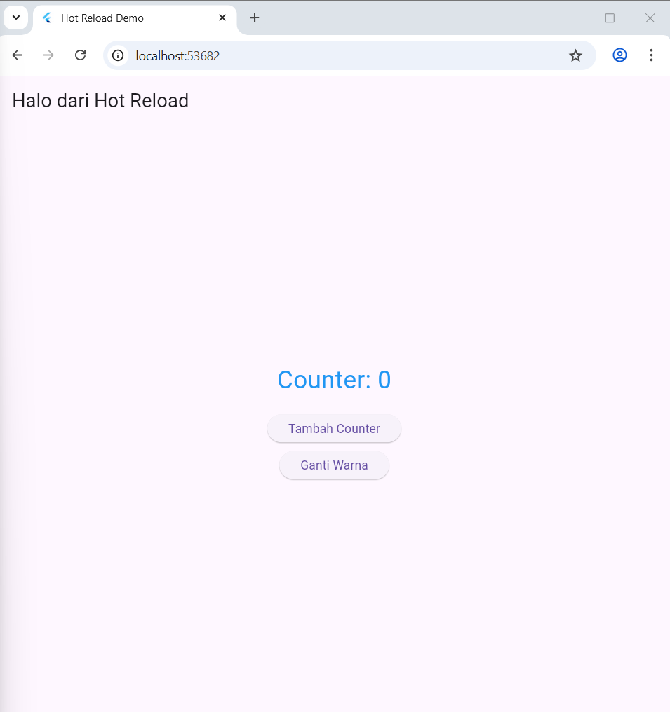 Setelah hot reload, warna AppBar langsung berubah dari biru menjadi merah, tanpa restart aplikasi.