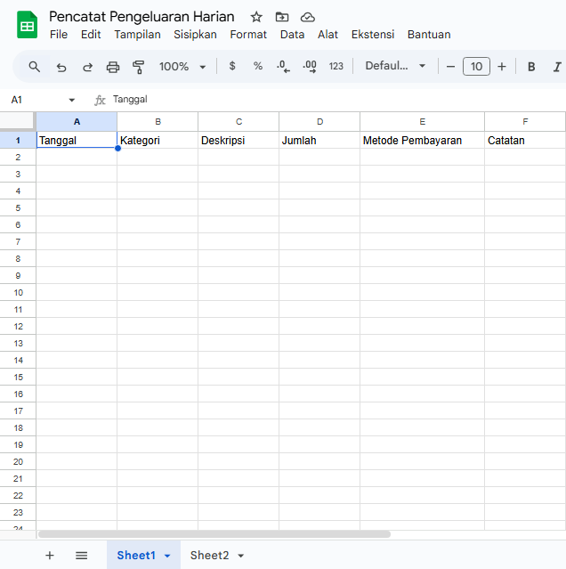 - Beri nama spreadsheet Anda: “Pencatat Pengeluaran Harian”