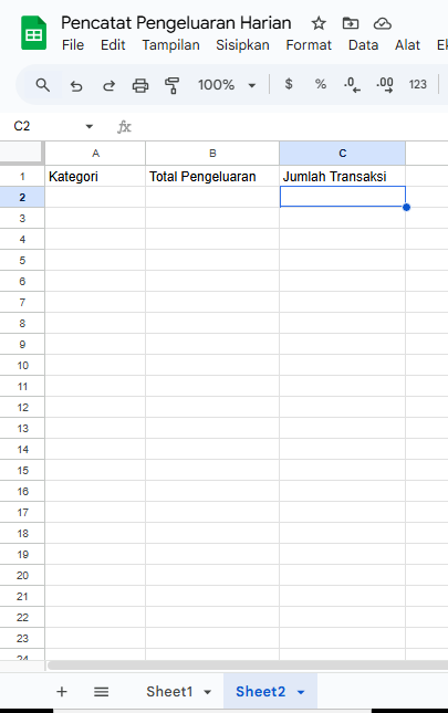 Kita akan membuat dua sheet: satu untuk data pengeluaran, satu untuk ringkasan.
