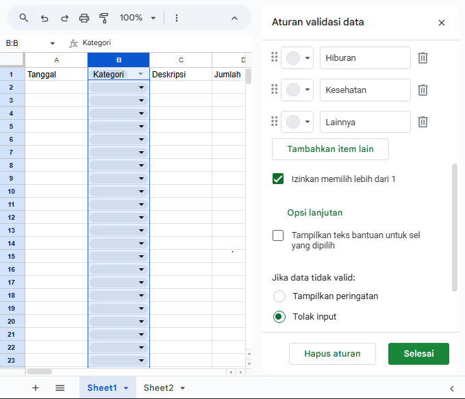 - Pilih kolom B (Kategori) di sheet Data Pengeluaran
