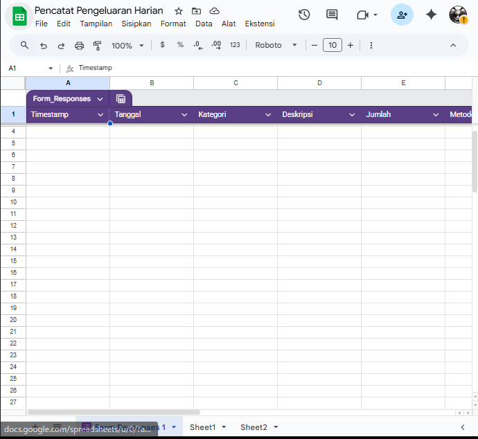 Google Forms akan otomatis membuat sheet baru bernama “Form Responses 1” di spreadsheet Anda.