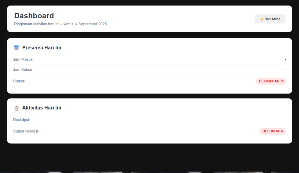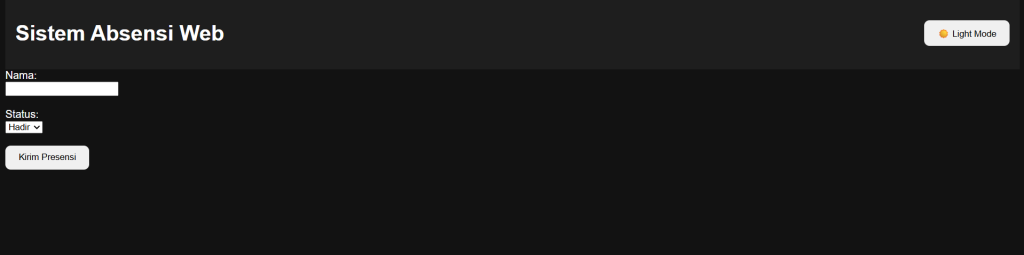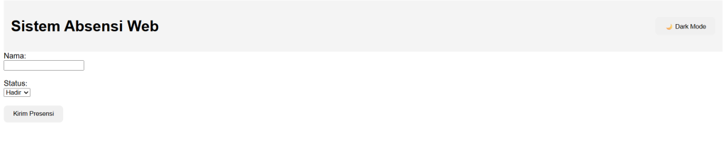 Namun, kalau kita lihat sistem absensi berbasis web sederhana, kebanyakan masih tampil dengan background putih polos. Bagi sebagian orang, tampilan terang memang nyaman, tetapi ada juga pengguna yang lebih suka tampilan gelap. Dengan menambahkan fitur dark mode, aplikasi absensi tidak hanya terlihat modern, tetapi juga memberi kebebasan kepada pengguna untuk memilih tampilan sesuai selera.