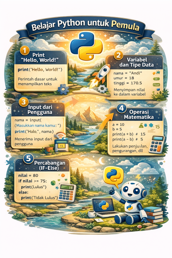 Berikut adalah 5 langkah dasar belajar Python yang umum digunakan oleh pemula. Setiap langkah dijelaskan secara ringkas dan disertai ilustrasi tutorial.