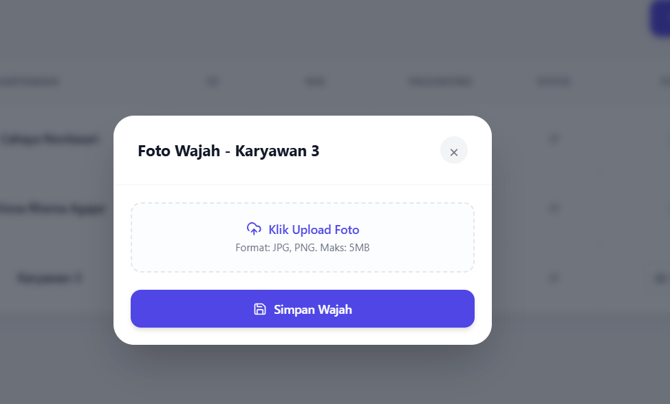 Modal antarmuka interaktif yang dipanggil oleh Admin untuk mendaftarkan wajah karyawan ke dalam database untuk pertama kalinya. Admin dapat menyesuaikan rasio muka (cropping) dan sistem akan mencetak data biometrik sebagai referensi model AI hanya dalam 1โ€“2 detik.