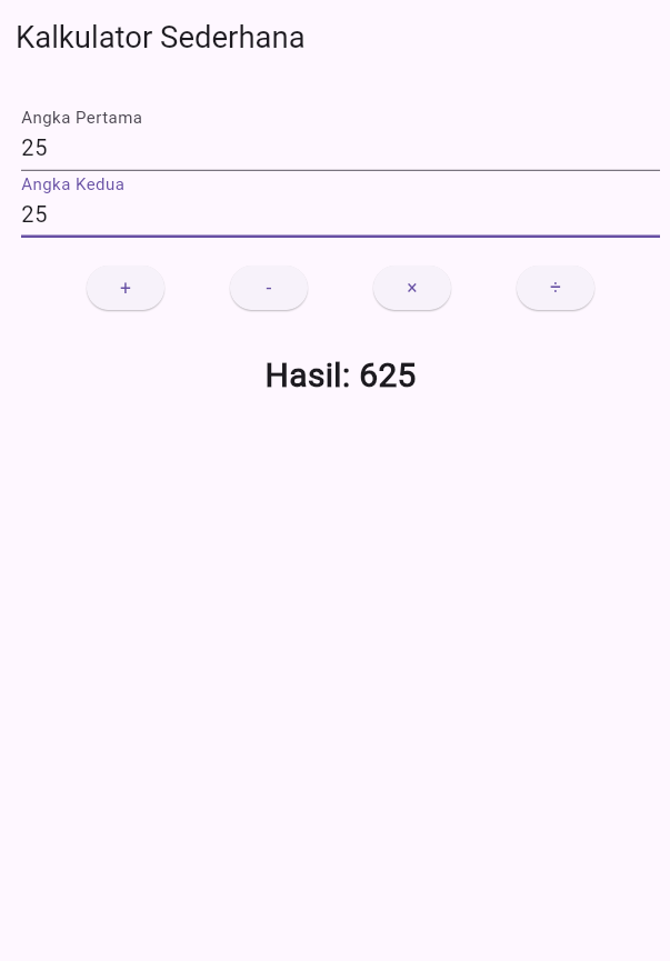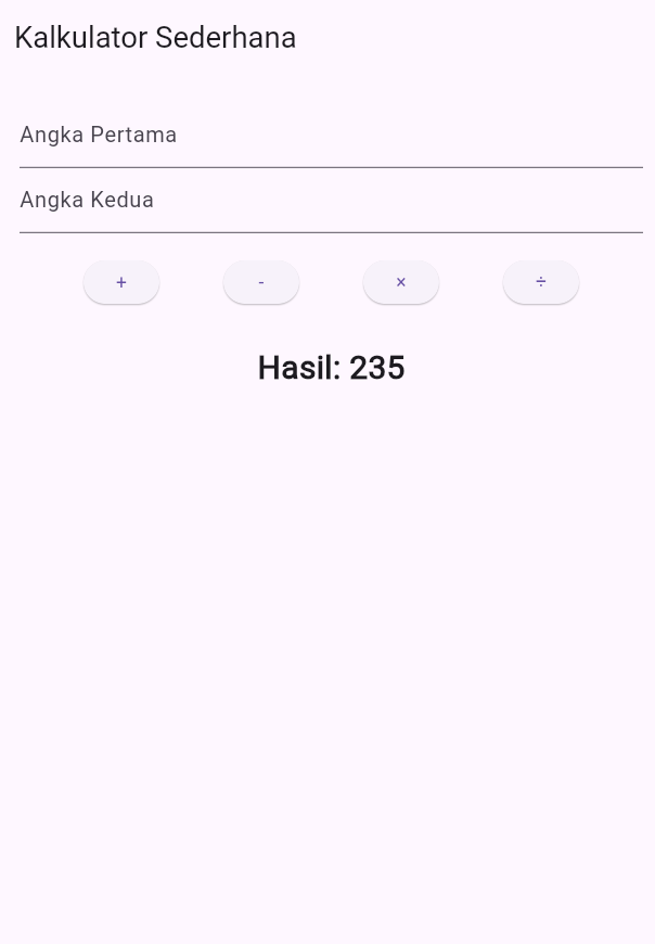 Jika berhasil, Anda akan melihat aplikasi kalkulator sederhana dengan dua input angka dan tombol operasi dasar