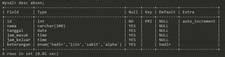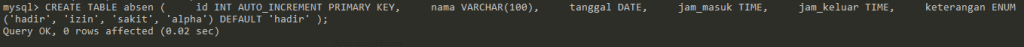 keterangan ENUM(‘hadir’, ‘izin’, ‘sakit’, ‘alpha’) DEFAULT ‘hadir’
