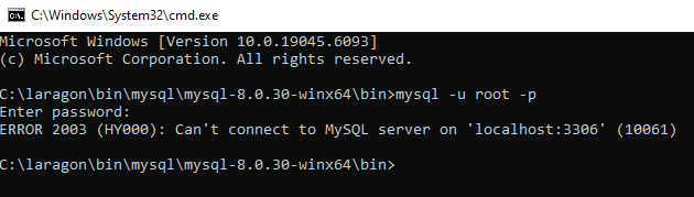 -u root: login sebagai userroot- Tidak perlu password di Laragon default