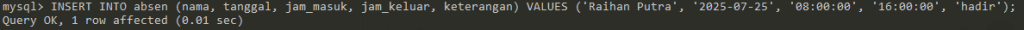 VALUES (‘Raihan Putra’, ‘2025-07-25′, ’08:00:00′, ’16:00:00’, ‘hadir’);