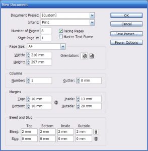 Kita akan menggunakan dokumen ukuran A4 standar untuk tutorial ini. Mulai dengan menetapkan jumlah halaman 8, berdarah 2 mm sehingga kita memiliki beberapa ruang untuk gambar yang tumpang tindih, margin sampai 10 mm atas dan bawah, margin dalam 13 mm dan luar margin sampai dengan 20 mm. Alasan untuk margin yang berbeda ini adalah bahwa dalam spread dengan 2 halaman margin sedikit lebih besar di bagian luar halaman terlihat lebih baik dan menyediakan ruang untuk menampung versi cetak. Hal ini juga berguna untuk grid halaman pada langkah berikutnya.
