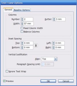 Buka Text Frame Options dengan klik kanan pada text frame dan ubah kolom menjadi beberapa dari 2 dengan gutter 3 mm. Dengan cara ini panjang garis berkurang dan pembacaannya meningkat.
