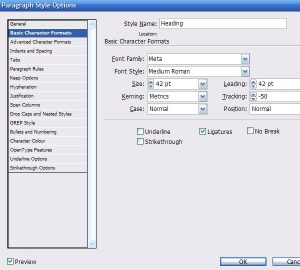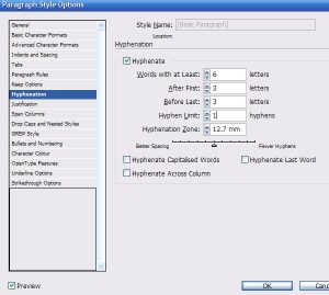 Tanda hubung yang benar sangat penting untuk teks dibenarkan. Istirahat kata-kata yang panjang pada akhir sebuah kolom sehingga kolom memiliki tepi yang lurus bukan yang mengandung sejumlah besar kesenjangan. Pengaturan default tanda hubung yang benar di InDesign perlu menyesuaikan beberapa untuk meningkatkan tampilan tubuh teks. Saya mengubah pengaturan untuk menggunakan tanda hubung yang benar hanya untuk kata-kata dengan setidaknya 6 huruf, dan setelah yang pertama dan sebelum terakhir 3 huruf. Batas tanda hubung menentukan berapa banyak baris berturut-turut dapat memiliki tanda hubung di akhir. Saya pikir 3 terlalu banyak dan maksimal 1 terlihat jauh lebih baik. Selanjutnya, Anda harus menonaktifkan kotak centang untuk kata kapital dan kata terakhir.