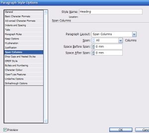 Sebuah fungsi baru di InDesign CS5 adalah kemungkinan untuk paragrap ke span berbagai kolom. Kita akan menggunakan bahwa di sini untuk membuat judul span di kolom kedua dari frame teks. Mengatur tata letak paragrap ke Span kolom dan rentang untuk semua.
