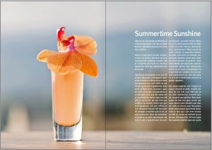 Buat bingkai teks yang ditempatkan pada posisi vertikal dan horisontal yang sama seperti koktail di halaman lain, di baris ketiga, kolom kelima grid. Hal ini menciptakan garis imajiner yang menghubungkan gambar dengan teks. Saya telah menggunakan judul foto tersebut, ‘Summertime Sunshine’ sebagai judul dan mengisi sisa frame dengan fungsi “Isi dengan teks placeholder” dari InDesign.
