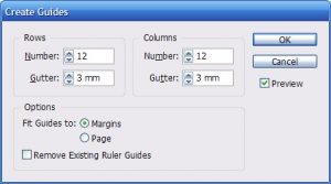 Untuk mengatur halaman grid, pergi ke “A-master spread” dan memilih tata letak > membuat panduan. Grid digunakan untuk menjaga konsistensi dalam tata letak halaman dan menyediakan kerangka kerja untuk posisi konten. Grid yang digunakan dengan baik adalah hal pertama yang Anda perlukan untuk memberi tata letak tampilan profesional Anda. Untuk tutorial ini kita akan menggunakan 12 baris dengan 12 kolom grid dengan jarak tanam 3 mm. Pilih sesuai dengan panduan untuk margin untuk membuat grid dengan lebar kolom 12 mm.