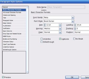 Pergi ke palet gaya paragraf dan ubah gaya Paragraf Dasar. Saya telah menggunakan FF Meta buku Roman dengan ukuran 12 pt dan terkemuka 16 pt. Anda juga dapat meninggalkan yang terdepan pada pengaturan otomatis karena grid awal kami akan memastikan semua teks sesuai dengan baik.