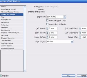 Pergi ke indentasi dan spasi dan set keselarasan ke Left Justify. Di web, teks justifikasi yang bagus sepertinya tidak mungkin tercapai, namun InDesign membuatnya sangat mudah dilakukan. Juga, ubah setelan Align to Grid menjadi All Lines, dan tambahkan 16 pts ruang setelah paragraf. Ini tidak perlu dan Anda juga bisa menggunakan First Line Indent untuk memisahkan paragraf.
